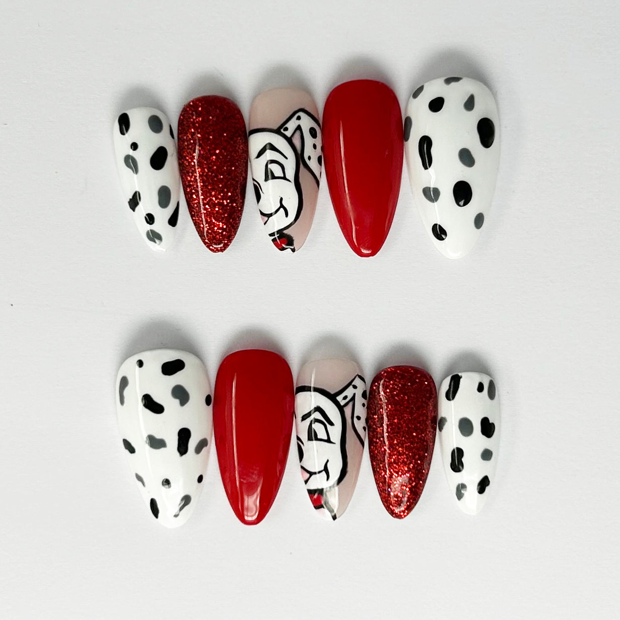 Cada set de uñas, de forma almendrada y larga, está pintado a mano con esmaltes de máxima calidad por la manicurista Rita Cahué, garantizando un acabado profesional y una durabilidad excepcional. Las uñas se personalizan según tus medidas exactas para un ajuste cómodo y seguro.