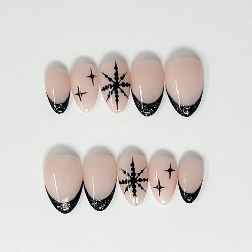 Estas uñas press-on reinventan la estética navideña con detalles oscuros y un acabado impecable que aportan un aire moderno y audaz. Perfectas para quienes buscan celebrar las fiestas con un toque de originalidad sin perder el espíritu elegante de la temporada.